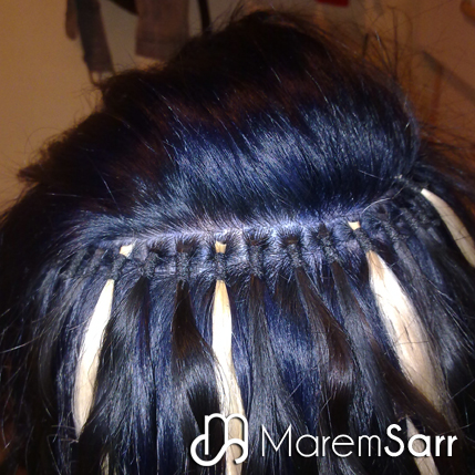 Las extensiones de hilo goma/nudo consiste en atarlas mechón a mechón con hilo goma. Es una de las técnicas más eficaces del mercado, por que aguantan hasta 3 meses y no te rompen el pelo a la hora de quitarla. Hace el mismo efecto que las extensiones de Keratina, pero sin llegar a ser tan dañinas para el cabello. No se aplica nada de pegamento, por lo que el retirado es tan sencillo como cortar el hilo, retirar la extensión y…. ¡voilà, tu pelo tan natural como siempre!