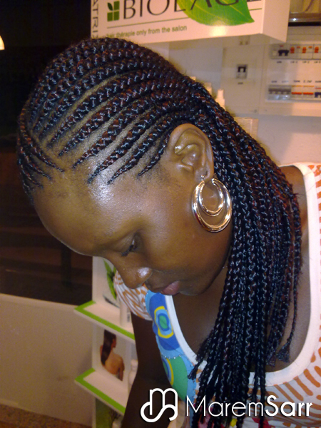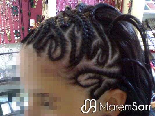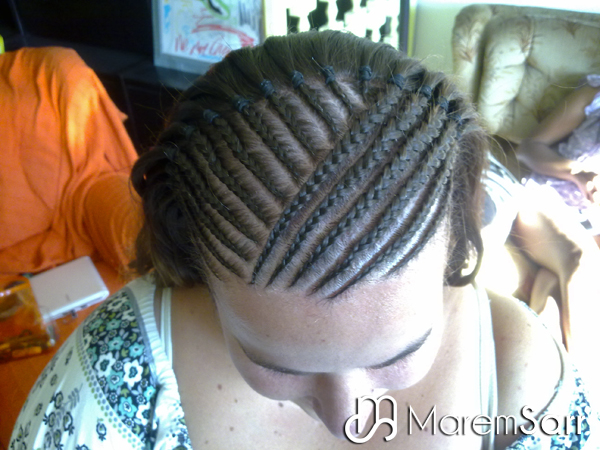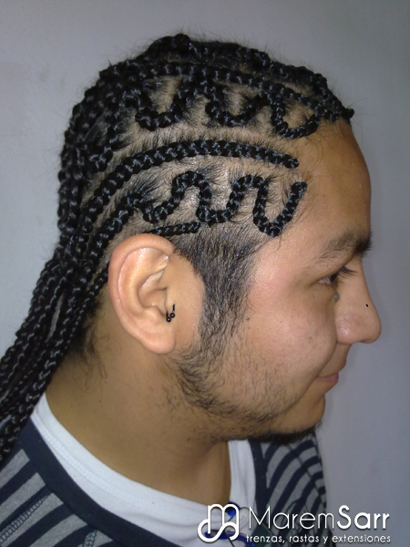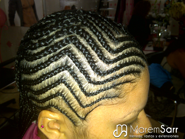 Trenzas pegadas al cuero cabelludo sin extensiones, solo del propio pelo de la persona. Éstas son las típicas trenzas con dibujos que ves en las revistas. Aguantan hasta un mes y medio y se tarda unas dos horas en hacerlas.